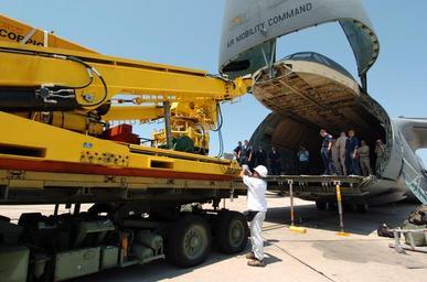 | Keywords: US Navy 050805-N-8629M-106 ROV Super Scorpio is loaded aboard an Air Force C-5.jpg en Naval Air Station North Island San Diego Calif Aug 5 2005 Sailors assigned to the U S Navy's Deep Submergence Unit Naval Base Coronado make preparations to load Super Scorpio a robotic rescue vehicle aboard an Air Force C-5 Galaxy aircraft The Navy is transporting two of the remotely operated vehicles in an effort to assist the rescue of seven Russian Sailors trapped on the ocean floor in a mini-submarine off the Kamchatka Peninsula The Super Scorpios and a team of U S Navy technicians are to be flown from San Diego to Petropavolvsk and then transported by truck to be embarked on a Russian ship before making a descent to the stranded submarine U S Navy photo by Photographer's Mate 3rd Class Rebecca J Moat RELEASED 2005-08-05 050805-N-8629M-106 Navy http //www navy mil/view_image asp id 26915 U S Navy photo by Photographer's Mate 3rd Class Rebecca J Moat PD-USGov-Military-Navy Scorpio ROV at Naval Air Station North Island Transport of vehicles by C-5 Galaxy Lockheed C-5 Galaxy nose loading doors |