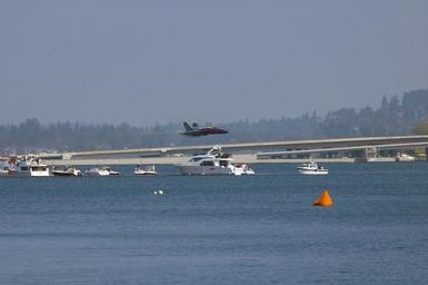 | Keywords: US Navy 050806-N-3390M-017 he lead solo pilot assigned to the U.S. Navy flight demonstration team, the Blue Angels, conducts a high-speed, low level pass over Lake Washington.jpg en Seattle Aug 6 2005 The lead solo pilot assigned to the U S Navy flight demonstration team the Blue Angels conducts a high-speed low level pass over Lake Washington during Seattle Seafair events in Seattle Wash The Blue Angels fly the F/A-18A Hornet performing approximately 30 maneuvers during the aerial demonstration lasting over an hour Seafair is Seattle's month-long traditional summer festival which includes parades amateur athletics air shows and boat racing U S Navy photo by Photographer's Mate 3rd Class Douglas G Morrison RELEASED 2005-08-06 050806-N-3390M-017 Navy http //www navy mil/view_image asp id 26986 U S Navy photo by Photographer's Mate 3rd Class Douglas G Morrison PD-USGov-Military-Navy Aircraft low altitude flight Blue Angels F/A-18 Hornets at Seafair 2005 Interstate 90 Lake Washington bridges |