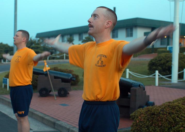 | Keywords: US Navy 050812-N-2385R-010 Chief petty officer (CPO) selectees, Navy Counselor 1st Class Harold Gibbs, left, and Master-at-Arms 1st Class Michael Estok, participate in an early morning physical training.jpg en Sasebo Japan Aug 12 2005 - Chief petty officer CPO selectees Navy Counselor 1st Class Harold Gibbs left and Master-at-Arms 1st Class Michael Estok participate in an early morning physical training exercise on board U S Fleet Activities Sasebo Japan U S Navy photo by Photographer's Mate 3rd Class Yesenia Rosas RELEASED 2005-08-12 050812-N-2385R-010 Navy http //www navy mil/view_image asp id 27110 U S Navy photo by Photographer's Mate 3rd Class Yesenia Rosas PD-USGov-Military-Navy United States Fleet Activities Sasebo Navy Counselor Master-at-arms Arms spread |