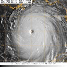 Keywords: US Navy 050828-N-0000W-002 GOES-12 Satellite image of Hurricane Katrina.jpg en Gulf of Mexico Aug 28 2005 GOES-12 Satellite image provided by the U S Naval Research Laboratory Monterey Calif showing the status of Hurricane Katrina at 1200Z or 7am EST The storm crossed South Florida Thursday and headed back to sea in the Gulf of Mexico The storm's wind has now increased to 160 mph a category 5 storm Only three Category 5 hurricanes the highest on the Saffir-Simpson scale have hit the United States since record keeping began The last was 1992's Hurricane Andrew which leveled parts of South Florida killed 43 people and caused 31 billion in damage The other two were the 1935 Labor Day hurricane that hit the Florida Keys and killed 600 people and Hurricane Camille which devastated the Mississippi coast in 1969 killing 256 Katrina was over the Gulf of Mexico about 250 miles south-southeast of the mouth of the Mississippi river at 7 a m local time according to an advisory posted on the U S National Hurricane Center's Web site The storm was moving toward the west-northwest at 12 mph U S Navy photo RELEASED 2005-08-28 050828-N-0000W-002 Navy http //www navy mil/view_image asp id 27442 U S Navy photo PD-USGov-Military-Navy Satellite pictures of Hurricane Katrina GOES 12 pictures