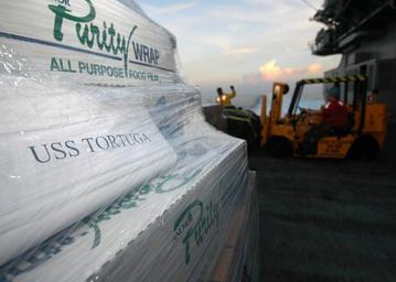 | Keywords: US Navy 050902-N-6403R-002 Aviation Boatswains Mates organizing pallets of bottled water on the flight deck aboard the amphibious assault ship USS Iwo Jima (LHD 7).jpg en Atlantic Ocean Sept 2 2005 Aviation Boatswains Mates organizing pallets of bottled water on the flight deck aboard the amphibious assault ship USS Iwo Jima LHD 7 The ship departed Norfolk to join other military assets as part of Joint Task Force Katrina to bring much-needed supplies and relief efforts to Gulf Coast states ravaged by Hurricane Katrina The Navy's involvement in the humanitarian assistance operations is led by the Federal Emergency Management Agency FEMA in conjunction with the Department of Defense U S Navy photo by Photographer's Mate Airman Joshua T Rodriguez RELEASED 2005-09-02 050902-N-6403R-002 Navy http //www navy mil/view_image asp id 27690 U S Navy photo by Photographer's Mate Airman Joshua T Rodriguez PD-USGov-Military-Navy Aboard USS Iwo Jima LHD-7 |