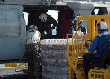 | Keywords: US Navy 050902-N-5561D-013 Sailors and Marines load a U.S. Navy MH-60S Seahawk helicopter with bottled water to deliver to the hurricane-ravaged Gulf Coast.jpg en Gulf of Mexico Sep 2 2005 - Sailors and Marines assigned to the amphibious assault ship USS Bataan LHD 5 and Helicopter Sea Control Squadron Two Eight HSC-28 load a U S Navy MH-60S Seahawk helicopter with bottled water to deliver to the hurricane-ravaged Gulf Coast The Navy's involvement in the humanitarian assistance operations is led by the Federal Emergency Management Agency FEMA in conjunction with the Department of Defense U S Navy photo by Journalist Seaman Joanne DeVera RELEASED 2005-09-02 050902-N-5561D-013 Navy http //www navy mil/view_image asp id 27641 U S Navy photo by Journalist Seaman Joanne DeVera PD-USGov-Military-Navy Aboard USS Bataan LHD-5 Military forklifts MH-60S Seahawk Helicopter Sea Combat Squadron 28 United States Navy |