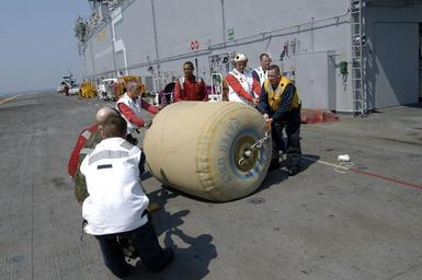 | Keywords: US Navy 050903-N-8154G-030 Crew members aboard the amphibious assault ship USS Bataan (LHD 5) work together to move a rubber bladder holding 500 gallons of fresh drinking water for transport.jpg en Gulf of Mexico Sept 3 2005 Crew members aboard the amphibious assault ship USS Bataan LHD 5 work together to move a rubber bladder holding 500 gallons of fresh drinking water for transport The Navy's involvement in the Hurricane Katrina humanitarian assistance operations is led by the Federal Emergency Management Agency FEMA in conjunction with the Department of Defense U S Navy photo by Photographer s Mate Airman Jeremy L Grisham RELEASED 2005-09-03 050903-N-8154G-030 Navy http //www navy mil/view_image asp id 27705 U S Navy photo by Photographer s Mate Airman Jeremy L Grisham PD-USGov-Military-Navy Aboard USS Bataan LHD-5 |