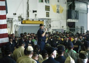 Keywords: US Navy 050915-N-7202W-002 U.S. Coast Guard Vice Adm. Thad W. Allen, principle federal official (PFO) for federal response to Hurricane Katrina, addresses the crew of the amphibious assault ship USS Iwo Jima (LHD 7).jpg en New Orleans Sept 15 2005 - U S Coast Guard Vice Adm Thad W Allen principle federal official PFO for federal response to Hurricane Katrina addresses the crew of the amphibious assault ship USS Iwo Jima LHD 7 during an all hands call in the ship s hangar bay Iwo Jima is currently pier side on the Mississippi River assisting in Joint Task Force Katrina hurricane relief efforts The Navy s involvement in the humanitarian assistance operations are effort led by the Federal Emergency Management Agency FEMA in conjunction with the Department of Defense U S Navy photo by Photographer's Mate Airman Amanda Williams RELEASED 2005-09-15 050915-N-7202W-002 Navy http //www navy mil/view_image asp id 28278 U S Navy photo by Photographer's Mate Airman Amanda Williams PD-USGov-Military-Navy Naval Air Station Joint Reserve Base New Orleans Aboard USS Iwo Jima LHD-7