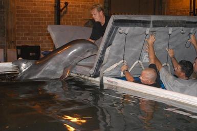 | Keywords: US Navy 050917-N-0793G-018 An Atlantic Bottlenose Dolphin displaced when hurricane Katrina is carefully placed in a temporary saltwater pool facility at the Naval Construction Battalion Center Gulfport.jpg en Gulfport Miss Sept 17 2005 - Kelly an Atlantic Bottlenose Dolphin displaced when hurricane Katrina destroyed her home at the Marine Life Oceanarium in Gulfport Miss is carefully placed in a temporary saltwater pool facility at the Naval Construction Battalion Center Gulfport The aboveground pool along with other necessary filtration equipment needed to care for sea mammals was provided by U S Navy Marine Mammal Program personnel from San Diego Calif Kelly has spent the last two and a half weeks in the Gulf of Mexico with seven other dolphins swept out to sea by a wave reported to be forty feet high during Hurricane Katrina Because these dolphins are from a captive facility they do not forage for food or necessarily have the survival skills needed to avoid predators or boat traffic Since they were spotted off the gulf coast on Saturday Sept 10 Marine Life Aquarium trainers and National Oceanic Atmospheric Administration NOAA Fisheries Service biologists have been feeding the dolphins several times a day from a NOAA vessel U S Navy photo by Journalist 3rd Class Chris Gethings RELEASED 2005-09-17 050917-N-0793G-018 Navy http //www navy mil/view_image asp id 28286 U S Navy photo by Journalist 3rd Class Chris Gethings PD-USGov-Military-Navy Tursiops truncatus captive Marine Life Oceanarium Naval Construction Battalion Center Gulfport United States Navy Marine Mammal Program Mammals of Mississippi |