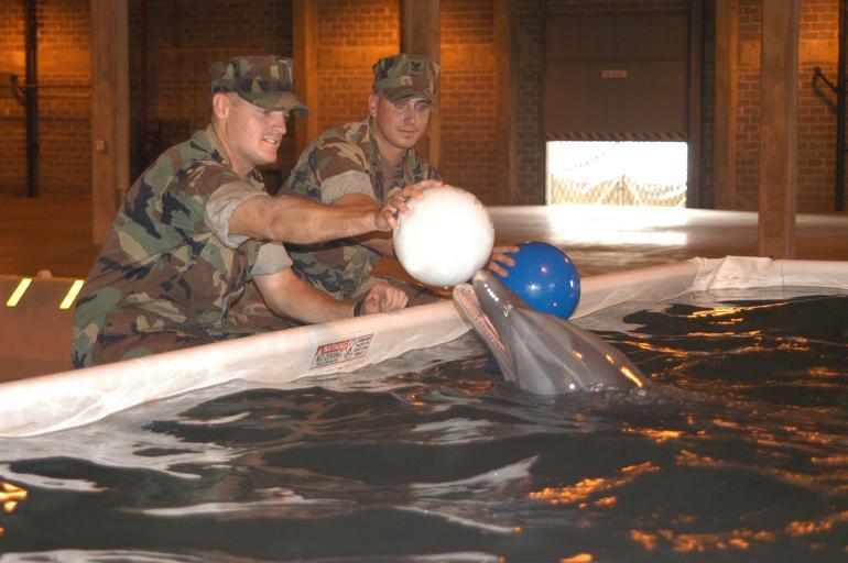 Keywords: US Navy 050917-N-0793G-001 Dolphins placed in a temporary saltwater pool facility at the Naval Construction Battalion Center Gulfport.jpg en Gulfport Miss Sept 17 2005 - Ens Michael Dobling left and Master-at-Arms 3rd Class Philip Myers welcomes one of four Atlantic Bottlenose Dolphins displaced when hurricane Katrina destroyed their home at the Marine Life Oceanarium in Gulfport Miss The dolphins are being placed in a temporary saltwater pool facility at the Naval Construction Battalion Center Gulfport U S Navy Marine Mammal Program personnel from San Diego Calif provided the aboveground facility along with other necessary filtration equipment needed to care for sea mammals The dolphins spent the last two and a half weeks in the Gulf of Mexico swept out to sea by a wave reported to be forty feet high during Hurricane Katrina Because these dolphins are from a captive facility they do not forage for food or necessarily have the survival skills needed to avoid predators or boat traffic Since they were spotted off the gulf coast on Saturday Sept 10 Marine Life Aquarium trainers and National Oceanic Atmospheric Administration NOAA Fisheries Service biologists have been feeding the dolphins several times a day from a NOAA vessel U S Navy photo by Journalist 3rd Class Chris Gethings RELEASED 2005-09-17 050917-N-0793G-001 Navy http //www navy mil/view_image asp id 28294 U S Navy photo by Journalist 3rd Class Chris Gethings PD-USGov-Military-Navy Marine Life Oceanarium Master-at-arms Naval Construction Battalion Center Gulfport United States Navy Marine Mammal Program Mammals of Mississippi |