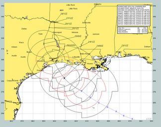 | Keywords: US Navy 050923-N-0000X-002 Current forecast projected path and wind speeds of Hurricane Rita from Sept 23 to Sept 28. Rita, a dangerous category three hurricane on the Saffir-Simpson Hurricane scale.jpg en Gulf of Mexico Sept 23 2005 - Current forecast projected path and wind speeds of Hurricane Rita from Sept 23 to Sept 28 Rita a dangerous category three hurricane on the Saffir-Simpson Hurricane scale has maximum sustained winds near 135 mph with higher gusts Hurricane force winds extend outward up to 85 miles from the center and tropical storm force winds extend outward up to 205 miles The eye of Hurricane Rita was located approximately 220 miles Southeast of Galveston Texas and about 210 miles Southeast of Port Arthur Texas U S Navy photo RELEASED For more information go to <a href http //www nrlmry navy mil Target _BLANK >www nrlmry navy mil</a>/ 2005-09-23 050923-N-0000X-002 Navy http //www navy mil/view_image asp id 28506 U S Navy photo PD-USGov-Military-Navy Maps of the Gulf of Mexico |