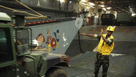 | Keywords: US Navy 051002-N-7945K-050 Boatswain's Mate 3rd Class William Narcusbrown, assigned to a Landing Craft, Utility (LCU) from Assault Craft Unit Two, directs the driver of a High Mobility Multipurpose Wheeled Vehicle.jpg en Atlantic Ocean Oct 2 2005 - Boatswain's Mate 3rd Class William Narcusbrown assigned to a Landing Craft Utility LCU from Assault Craft Unit Two directs the driver of a High Mobility Multipurpose Wheeled Vehicle HMMWV to back down the loading ramp of his LCU in the well deck aboard the amphibious dock landing ship USS Austin LPD 4 Four LCUs transferred equipment from the shores of Camp Lejune N C to Austin and other ships in Expeditionary Strike Group Eight and back again during the Certification Exercise CERTEX The exercise will allow the crew of Austin to work closely and train with Marines of the 22nd Marine Expeditionary Unit in a scenario-based training environment CERTEX is Austin s final underway exercise before deployment U S Navy photo by Photographer's Mate 3rd Class Andrew King RELEASED 2005-10-02 051002-N-7945K-050 Navy http //www navy mil/view_image asp id 28738 U S Navy photo by Photographer's Mate 3rd Class Andrew King PD-USGov-Military-Navy USS Austin LPD-4 Landing craft utility Well decks |