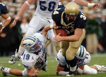 | Keywords: US Navy 051008-N-9693M-015 U.S. Naval Academy Midshipman full back Matt Hall is pulled down by Air Force free safety Ty Paffett (19) and free safety Bobby Giannini (11) during the 2nd quarter of play against the Falcons.jpg en Annapolis Md Oct 8 2005 - U S Naval Academy Midshipman full back Matt Hall is pulled down by Air Force free safety Ty Paffett 19 and free safety Bobby Giannini 11 during the 2nd quarter of play against the Falcons A last second field goal gave the Midshipmen the win over the Falcons 27-24 at Navy-Marine Corps Stadium The victory gives Navy 2-2 a good opportunity to retain the Commander-in-Chief's Trophy awarded to the team with the best record in games between the three major service academies Navy won it in 2003 and 2004 and will retain the trophy unless winless Army beats Air Force and Navy U S Navy photo by Damon J Moritz RELEASED 2005-10-08 051008-N-9693M-015 Navy http //www navy mil/view_image asp id 28768 U S Navy photo by Damon J Moritz PD-USGov-Military-Navy U S Naval Academy Midshipmen vs Air Force Falcons Oct 8 2005 |