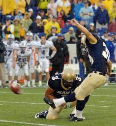 | Keywords: US Navy 051008-N-9693M-018 U.S. Naval Academy Midshipmen kicker Joey Bullen kicks a field goal with 4-10ths of a second left in the game against Air Force for three points.jpg en Annapolis Md Oct 8 2005 - U S Naval Academy Midshipmen kicker Joey Bullen kicks a field goal for three points with 4/10ths of a second left in the game against Air Force The field goal held by Brian Hampton 3 gave the Midshipmen the win over the Falcons 27-24 at Navy-Marine Corps Stadium The victory gives Navy 2-2 a good opportunity to retain the Commander-in-Chief's Trophy awarded to the team with the best record in games between the three major service academies Navy won it in 2003 and 2004 and will retain the trophy unless winless Army beats Air Force and Navy U S Navy photo by Damon J Moritz RELEASED 2005-10-08 051008-N-9693M-018 Navy http //www navy mil/view_image asp id 28769 U S Navy photo by Damon J Moritz PD-USGov-Military-Navy U S Naval Academy Midshipmen vs Air Force Falcons Oct 8 2005 Navy Midshipmen football Field goal |