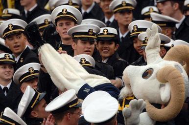 | Keywords: US Navy 051008-N-9693M-016 U.S. Naval Academy mascot.jpg en Annapolis Md Oct 8 2005 - U S Naval Academy mascot Bill the goat surfs through the Brigade of Midshipmen during the Air Force-Navy football game A last second field goal gave the the Midshipmen the win over the Falcons 27-24 at Navy-Marine Corps Stadium The victory gives Navy 2-2 a good opportunity to retain the Commander-in-Chief's Trophy awarded to the team with the best record in games between the three major service academies Navy won it in 2003 and 2004 and will retain the trophy unless winless Army beats Air Force and Navy U S Navy photo by Damon J Moritz RELEASED 2005-10-08 051008-N-9693M-016 Navy http //www navy mil/view_image asp id 28772 U S Navy photo by Damon J Moritz PD-USGov-Military-Navy Taken with Nikon D2X U S Naval Academy Midshipmen vs Air Force Falcons Oct 8 2005 Bill the Goat |