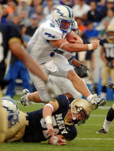 | Keywords: US Navy 051008-N-9693M-012 Air Force Quarterback Shaun Carney (5) leaps over U.S. Naval Academy Midshipman line backer Jake Biles for a rushing gain in the second half of play.jpg en Annapolis Md Oct 8 2005 - Air Force Quarterback Shaun Carney 5 leaps over U S Naval Academy Midshipman line backer Jake Biles for a rushing gain in the second half of play A last second field goal gave the Midshipmen the win over the Falcons 27-24 at Navy-Marine Corps Stadium The victory gives Navy 2-2 a good opportunity to retain the Commander-in-Chief's Trophy awarded to the team with the best record in games between the three major service academies Navy won it in 2003 and 2004 and will retain the trophy unless winless Army beats Air Force and Navy U S Navy photo by Damon J Moritz RELEASED 2005-10-08 051008-N-9693M-012 Navy http //www navy mil/view_image asp id 28773 U S Navy photo by Damon J Moritz PD-USGov-Military-Navy U S Naval Academy Midshipmen vs Air Force Falcons Oct 8 2005 |