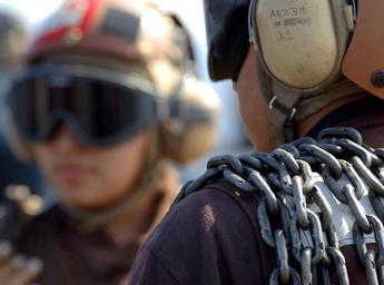 | Keywords: US Navy 051015-N-2984R-009 Squadron plane captains hold tie down chains used to tie down aircraft on their shoulders during flight operations.jpg en Atlantic Ocean Oct 15 2005 Squadron plane captains hold tie down chains used to tie down aircraft on their shoulders during flight operations aboard the Nimitz-class aircraft carrier USS Harry S Truman CVN 75 Truman is currently conducting carrier qualifications and sustainment training with embarked Carrier Air Wing Three CVW-3 off the East Coast U S Navy photo by Photographer's Mate Airman Ricardo J Reyes RELEASED 2005-10-15 051015-N-2984R-009 Navy http //www navy mil/view_image asp id 29331 U S Navy photo by Photographer's Mate Airman Ricardo J Reyes PD-USGov-Military-Navy Aboard USS Harry S Truman CVN-75 Aircraft tie-down chains |