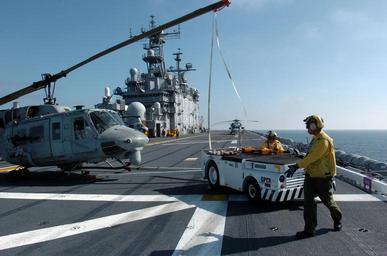 | Keywords: US Navy 051114-N-9866B-055 An Aviation Boatswain's Mate directs the driver of a tow tractor as he backs a U.S. Marine Corps UH-1N Huey helicopter to its parking space.jpg en Pacific Ocean Nov 14 2005 - An Aviation Boatswain's Mate directs the driver of a tow tractor as he backs a U S Marine Corps UH-1N Huey helicopter to its parking space on the flight deck of the amphibious assault ship USS Peleliu LHA 5 Peleliu is currently underway for a 10-day Expeditionary Strike Group exercise in preparation for an upcoming scheduled deployment U S Navy photo by Journalist 2nd Class Zack Baddorf RELEASED 2005-11-14 051114-N-9866B-055 Navy http //www navy mil/view_image asp id 30040 U S Navy photo by Journalist 2nd Class Zack Baddorf PD-USGov-Military-Navy Aviation Boatswain's Mates Bell UH-1N Twin Huey Aboard USS Peleliu LHA-5 |