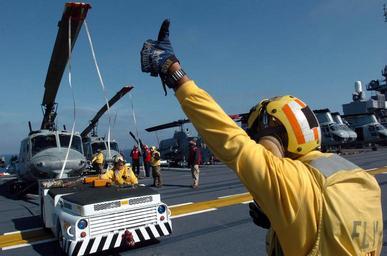| Keywords: US Navy 051114-N-9866B-041 An Aviation Boatswain^rsquo,s Mate directs the driver of a tow tractor as he backs a U.S. Marine Corps UH-1N Huey helicopter to its parking space.jpg en Pacific Ocean Nov 14 2005 An Aviation Boatswain s Mate directs the driver of a tow tractor as he backs a U S Marine Corps UH-1N Huey helicopter to its parking space on the flight deck of the amphibious assault ship USS Peleliu LHA 5 Peleliu is currently underway for a 10-day Expeditionary Strike Group exercise in preparation for an upcoming scheduled deployment U S Navy photo by Journalist 2nd Class Zack Baddorf RELEASED 2005-11-14 051114-N-9866B-041 Navy http //www navy mil/view_image asp id 29938 U S Navy photo by Journalist 2nd Class Zack Baddorf PD-USGov-Military-Navy Bell UH-1N Twin Huey Aboard USS Peleliu LHA-5 |