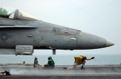 | Keywords: US Navy 051115-N-6484E-008 A catapult shooter gives the signal to launch as an F-A-18C Hornet launches from the flight deck of the Nimitz-class aircraft carrier USS Theodore Roosevelt (CVN 71).jpg en Persian Gulf Nov 15 2005 - A catapult shooter gives the signal to launch as an F/A-18C Hornet assigned to the Golden Warriors of Strike Fighter Squadron Eight Seven VFA-87 launches from the flight deck of the Nimitz-class aircraft carrier USS Theodore Roosevelt CVN 71 Roosevelt and embarked Carrier Air Wing Eight CVW-8 are currently underway in the Persian Gulf supporting Operation Steel Curtain a joint U S -Iraqi military offensive aimed at preventing cells of Al Qaeda from entering Iraq through the Syrian border U S Navy photo by Photographer's Mate Airman Stephen Early RELEASED 2005-11-15 051115-N-6484E-008 Navy http //www navy mil/view_image asp id 30004 U S Navy photo by Photographer's Mate Airman Stephen Early PD-USGov-Military-Navy USS Theodore Roosevelt CVN-71 flight deck Strike Fighter Squadron 87 United States Navy |