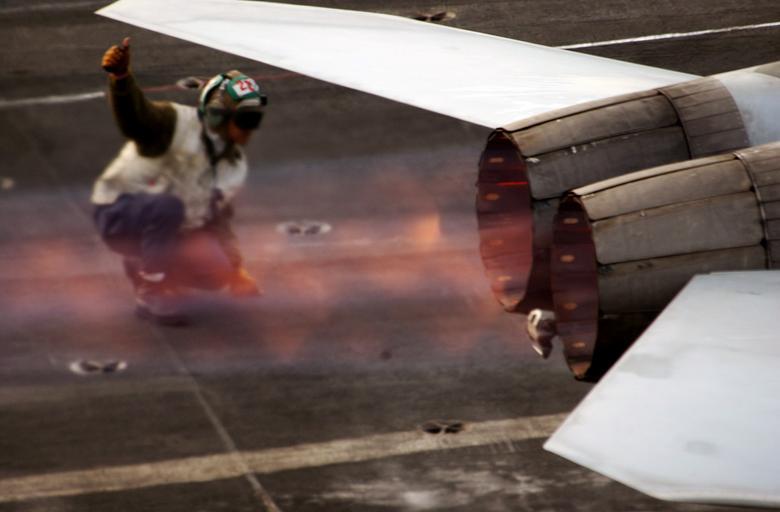 | Keywords: US Navy 051210-N-5549O-048 An aircraft troubleshooter assigned to the.jpg en Pacific Ocean Dec 10 2005 - An aircraft troubleshooter assigned to the Eagles of Strike Fighter Squadron One One Five VFA-115 verifies that one of his squadron s F/A-18E Super Hornets is safely ready for launch from the flight deck of the Nimitz-class aircraft carrier USS Ronald Reagan CVN 76 Reagan and embarked Carrier Air Wing Fourteen CVW-14 are currently underway in the Pacific Ocean conducting Joint Task Force Exercise JTFEX U S Navy photo by Photographer's Mate 3rd Class Kevin S O'Brien RELEASED 2005-12-10 051210-N-5549O-048 Navy http //www navy mil/view_image asp id 30633 U S Navy photo by Photographer's Mate 3rd Class Kevin S O'Brien PD-USGov-Military-Navy F/A-18 Hornet launches from USS Ronald Reagan CVN-76 Strike Fighter Squadron 115 United States Navy |