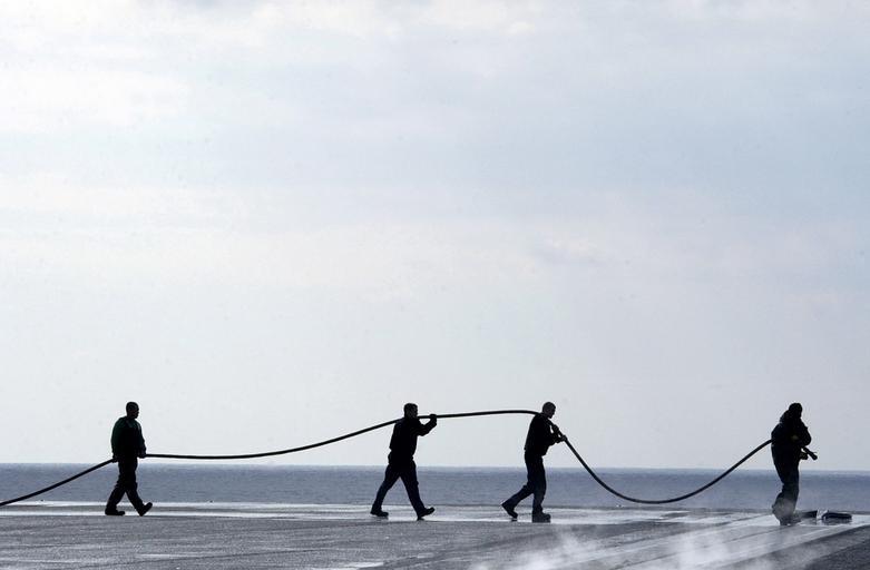 | Keywords: US Navy 051216-N-4776G-072 Four Sailors carry a fire hose across the flight deck aboard the Nimitz-class aircraft carrier USS Ronald Reagan (CVN 76).jpg en Pacific Ocean Dec 16 2005 - Four Sailors carry a fire hose across the flight deck aboard the Nimitz-class aircraft carrier USS Ronald Reagan CVN 76 Reagan just completed a nine-day Joint Task Force Exercise JTFEX which is the final step in preparing the Ronald Reagan Carrier Strike Group for deployment U S Navy photo by Photographer's Mate Airman Kathleen Gorby RELEASED 2005-12-16 051216-N-4776G-072 Navy http //www navy mil/view_image asp id 30788 U S Navy photo by Photographer's Mate Airman Kathleen Gorby PD-USGov-Military-Navy Flight deck of USS Ronald Reagan CVN-76 Fire hoses |