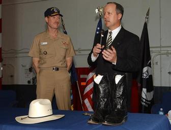 | Keywords: US Navy 051221-N-2532P-030 Executive Director of the Ronald Reagan Presidential Library, Duke Blackwood, right, explains the history of a pair of boots and cowboy hat worn by President Ronald Reagan.jpg en San Diego Dec 21 2005 - Executive Director of the Ronald Reagan Presidential Library Duke Blackwood right explains the history of a pair of boots and cowboy hat worn by President Ronald Reagan during a Dec 21 memorabilia dedication ceremony aboard Nimitz-class aircraft carrier USS Ronald Reagan CVN 76 Commander Carrier Strike Group Seven CSG-7 Rear Adm Michael H Miller accepted the items on behalf of the crew U S Navy photo by Airman Zachary Pierce RELEASED 2005-12-21 051221-N-2532P-030 Navy http //www navy mil/view_image asp id 30840 U S Navy photo by Airman Zachary Pierce PD-USGov-Military-Navy Ronald Reagan Guests aboard USS Ronald Reagan CVN-76 Michael H Miller Men with cowboy hats Cowboy boots Men with microphones |