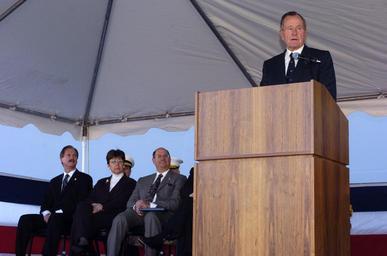 Keywords: US Navy 060114-N-2568S-088 The 41st President of the United States George H. W. Bush delivers his remarks as keynote speaker during the commissioning of the Navy^rsquo,s newest warship, the amphibious transport dock ship USS Sa.jpg en Ingleside Texas Jan 14 2006 The 41st President of the United States George H W Bush delivers his remarks as keynote speaker during the commissioning of the Navy s newest warship the amphibious transport dock ship USS San Antonio LPD 17 As the first in her class San Antonio represents a key element of the Navy s seabase transformation Collectively San Antonio-class will functionally replace over 41 ships LPD 4 LSD 36 LKA 113 and LST 1179 classes of amphibious ships providing the Navy and Marine Corps with modern seabased platforms that are networked survivable and built to operate with 21st century transformational platforms such as the MV-22 Osprey the Expeditionary Fighting Vehicle EFV and future means by which Marines are delivered ashore U S Navy photo by Chief Journalist Craig P Strawser RELEASED 2006-01-14 060114-N-2568S-088 Navy http //www navy mil/view_image asp id 31245 U S Navy photo by Chief Journalist Craig P Strawser PD-USGov-Military-Navy Commissioning of USS San Antonio LPD-17 George H W Bush