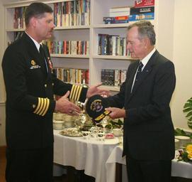 | Keywords: US Navy 060114-N-0191T-066 USS San Antonio (LPD 17) Commanding Officer, Captain Jonathan M. Padfield presents the 41st President of the United States, the Honorable George H.W. Bush with an honorary ship^rsquo,s ball cap, durin.jpg en Ingleside Texas Jan 14 2006 - USS San Antonio LPD 17 Commanding Officer Captain Jonathan M Padfield presents the 41st President of the United States the Honorable George H W Bush with an honorary ship s ball cap during commissioning day aboard San Antonio President Bush provided the key address during the ceremony held on board Naval Station Ingleside As the first in her class USS San Antonio LPD 17 represents a key element of the Navy s seabase transformation Collectively San Antonio-class will functionally replace over 41 ships LPD 4 LSD 36 LKA 113 and LST 1179 classes of amphibious ships providing the Navy and Marine Corps with modern seabased platforms that are networked survivable and built to operate with 21st century transformational platforms such as the MV-22 Osprey the Expeditionary Fighting Vehicle EFV and future means by which Marines are delivered ashore U S Navy photo by Journalist 2nd Class Anthony C Tornetta RELEASED 2006-01-14 060114-N-0191T-066 Navy http //www navy mil/view_image asp id 31232 U S Navy photo by Journalist 2nd Class Anthony C Tornetta PD-USGov-Military-Navy Commissioning of USS San Antonio LPD-17 George H W Bush |