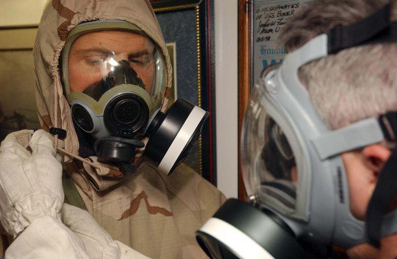 Keywords: US Navy 060116-N-0212M-001 Hull Technician 3rd Class Steven Colburn, stationed aboard the amphibious-assault ship USS Boxer (LHD 4) has his Chemical, Biological and Radiological (CBR) suit adjusted during a general quarters dri.jpg en Pacific Ocean Jan 16 2006 Hull Technician 3rd Class Steven Colburn stationed aboard the amphibious-assault ship USS Boxer LHD 4 has his Chemical Biological and Radiological CBR suit adjusted during a general quarters drill GQ Boxer is currently operating off of the California coast conducting shipboard training and flight deck qualifications U S Navy photo by Journalist 1st Class Michael Miller RELEASED 2006-01-16 060116-N-0212M-001 Navy http //www navy mil/view_image asp id 31906 U S Navy photo by Journalist 1st Class Michael Miller PD-USGov-Military-Navy Aboard USS Boxer LHD-4 Military protective clothing Males wearing gas masks MCU-2/P Protective Mask
