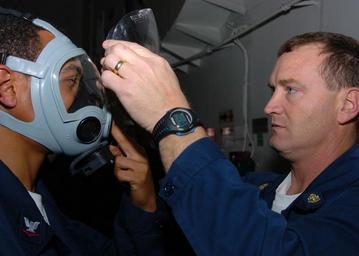 | Keywords: US Navy 060127-N-9641C-002 Chief Damage Controlman, John Brooks, removes the face shield from a Sailor^rsquo,s MCU-2-P gas mask.jpg en Atlantic Ocean Jan 27 2006 - Chief Damage Controlman John Brooks removes the face shield from a Sailor s MCU-2/P gas mask after washing it with decontamination solution during a General Quarters Drill aboard the Nimitz class aircraft carrier USS Dwight D Eisenhower CVN 69 Eisenhower is underway conducting carrier qualifications U S Navy photo by Airman Peter Carnicelli RELEASED 2006-01-27 060127-N-9641C-002 Navy http //www navy mil/view_image asp id 31569 U S Navy photo by Airman Peter Carnicelli PD-USGov-Military-Navy Damage Controlman Aboard USS Dwight D Eisenhower CVN-69 MCU-2/P Protective Mask Males wearing gas masks |