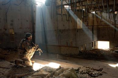 | Keywords: US Navy 060206-N-8252B-048 U.S. Army 2nd Lt. Amos Fox secures a building in a weapons compound in Hateen, Iraq, while providing security for the Ashurah pilgrims that will be passing through to Karbala.jpg en Hateen Iraq Feb 6 2006 - U S Army 2nd Lt Amos Fox secures a building in a weapons compound in Hateen Iraq while providing security for the Ashurah pilgrims that will be passing through to Karbala Fox is a fire support officer for Bravo Company 2nd Battalion 8th Infantry Regiment 2nd Brigade Combat Team 4th Infantry Division U S Navy photo by Photographer's Mate 2nd Class Katrina Beeler RELEASED fa عراق، استان کربلا ۶ فوریه ۲۰۰۶ ۷ محرم ۱۴۲۷ ، ستوان دوم آموس فاکس، افسر ارتش ایالات متحده آمریکا به شکلی کاملا مسلح در حال حفاظت و تامین امنیت برای زائران کربلا، اسلحه ای را نشانه گرفته است ستوان فاکس به عنوان افسر پشتیبان آتش در گروهان براوو، گردان دوم، هنگ هشتم پیاده نظام و تیپ دوم پیکار در ارتش آمریکا مشغول به کار است 2006-02-06 060206-N-8252B-048 Navy http //www navy mil/view_image asp id 32021 U S Navy photo by Photographer's Mate 2nd Class Katrina Beeler PD-USGov-Military-Navy Images from US Navy location Hateen Iraq |