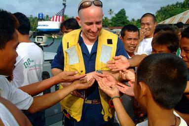| Keywords: US Navy 060220-N-4772B-458 Chief Warrant Officer Marc Manor hands-out candy to some of the townspeople from the small village of Leloan.jpg en Leloan Republic of the Philippines Feb 20 2006 - Chief Warrant Officer Marc Manor hands-out candy to some of the townspeople from the small village of Leloan as crews from the amphibious dock landing ship USS Harpers Ferry LSD 49 conduct a beach survey Harpers Ferry and the amphibious assault ship USS Essex LHD 2 are providing humanitarian assistance to victims in the Saint Bernard Municipality where the town of Guinsahugon located in the southern part of the island was completely devastated during a Feb 17 landslide U S Navy photo by Journalist 2nd Class Brian P Biller RELEASED 2006-02-20 060220-N-4772B-458 Navy http //www navy mil/view_image asp id 32099 U S Navy photo by Journalist 2nd Class Brian P Biller PD-USGov-Military-Navy Images from US Navy location Leloan Republic of the Philippines People handing out candy |