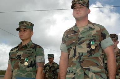 | Keywords: US Navy 060317-N-2903K-001 Petty Officer 2nd Class Paul Ryan Judi, left, and Seaman Gregory Chaney stand at attention after receiving the Navy Commendation Medal, for heroic efforts to help save a knife-attack victim's life.jpg en Santa Rita Guam March 17 2006 - Petty Officer 2nd Class Paul Ryan Judi left and Seaman Gregory Chaney stand at attention after receiving the Navy Commendation Medal for heroic efforts to help save a knife-attack victim's life during a routine port visit in Singapore The Judi and Chaney are assigned to Mobile Security Squadron Seven headquartered in Guam U S Navy photo Journalist 2nd Class B L Keller RELEASED 2006-03-17 060317-N-2903K-001 Navy http //www navy mil/view_image asp id 32886 U S Navy photo PD-USGov-Military-Navy Naval Base Guam United States Navy Mobile Security Squadron 7 |