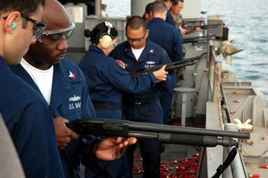 | Keywords: US Navy 060321-N-7130B-004 Sailors are instructed in the proper handling and use of a 12-guage shotgun during a familiarization firing exercise on the fantail of the Nimitz-class aircraft carrier USS Ronald Reagan (CVN 76).jpg en Persian Gulf March 21 2006 - Sailors are instructed in the proper handling and use of a 12-guage shotgun during a familiarization firing exercise on the fantail of the Nimitz-class aircraft carrier USS Ronald Reagan CVN 76 Reagan and embarked Carrier Air Wing One Four CVW-14 are currently on a deployment conducting Maritime Security Operations MSO in support of the global war on terrorism U S Navy photo by Photographer's Mate 3rd Class Aaron Burden RELEASED 2006-03-21 060321-N-7130B-004 Navy http //www navy mil/view_image asp id 32971 U S Navy photo by Photographer's Mate 3rd Class Aaron Burden PD-USGov-Military-Navy Firearms training on USS Ronald Reagan CVN-76 Males with shotguns Mossberg 500 |