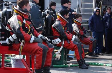 | Keywords: US Navy 060329-F-3759D-001 U.S. Navy divers assigned to the rescue and salvage ship USS Safeguard (ARS 50) prepare to dive.jpg en Yellow Sea March 29 2006 - U S Navy divers assigned to the rescue and salvage ship USS Safeguard ARS 50 prepare to dive near the wreckage of a U S Air Force F-16C lost at sea on March 14th Safeguard crews and the Republic of Korea Navy ship ROKS Pyong Taek ATS 27 took on the real-world salvage effort off the coast of Kunsan Air Base as part of salvage exercise SALVEX 06 U S Air Force photo by Senior Airman Joshua L DeMotts RELEASED 2006-03-29 060329-F-3759D-001 Navy http //www navy mil/view_image asp id 33326 U S Navy photo PD-USGov-Military-Navy Aboard USNS Safeguard T-ARS-50 Dry suits |