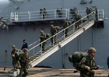| Keywords: US Navy 060402-N-4124C-063 Republic of Korea (ROK) Marines depart the amphibious dock landing ship USS Juneau (LPD 10) in Pohang.jpg en Pohang Republic of Korea April 2 2006 Republic of Korea ROK Marines depart the amphibious dock landing ship USS Juneau LPD 10 in Pohang Juneau and the rest of the forward-deployed Amphibious Ready Group ARG arrived in Pohang to backload personnel and equipment assigned to the 31st Marine Expeditionary Unit MEU after the completion of Reception Staging Onward Movement and Integration RSIO and Foal Eagle 2006 U S Navy photo by Journalist 3rd Class Adam R Cole RELEASED 2006-04-02 060402-N-4124C-063 Navy http //www navy mil/view_image asp id 33306 U S Navy photo by Journalist 3rd Class Adam R Cole PD-USGov-Military-Navy Images from US Navy location Pohang South Korea Foal Eagle 2006 Gangways watercraft Aboard USS Juneau LPD-10 |