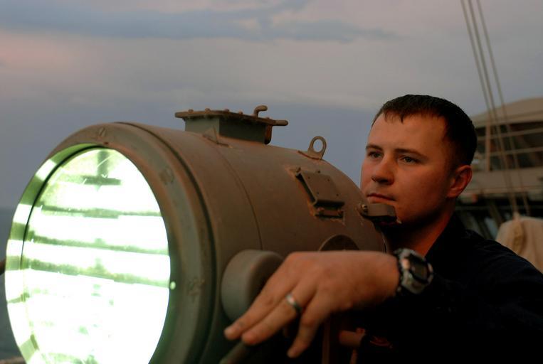 | Keywords: US Navy 060403-N-2959L-138 Quartermaster Seaman Caleb Robbins sends a message to the guided-missile cruiser USS Lake Champlain (CG 57) by flashing light on the signal bridge.jpg en Persian Gulf April 3 2006 Quartermaster Seaman Caleb Robbins sends a message to the guided-missile cruiser USS Lake Champlain CG 57 by flashing light on the signal bridge aboard the Nimitz-class aircraft carrier USS Ronald Reagan CVN 76 Reagan is currently deployed as part of a routine rotation of U S maritime forces in support of Operations Iraqi Freedom and Enduring Freedom as well as conducting Maritime Security Operations MSO in the region MSO helps deny international terrorists use of the maritime environment as a venue for attack or to transport personnel weapons or other material U S Navy photo by Photographer's Mate 3rd Class Dominique M Lasco RELEASED 2006-04-03 060403-N-2959L-138 Navy http //www navy mil/view_image asp id 33313 U S Navy photo by Photographer's Mate 3rd Class Dominique M Lasco PD-USGov-Military-Navy Aboard USS Ronald Reagan CVN-76 Naval signalling lamps |