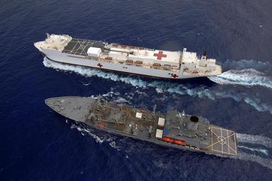 | Keywords: US Navy 060516-N-6501M-031 USNS Mercy performs an underway replenishment operation with USNS Pecos.jpg en Pacific Ocean May 16 2006 - The Military Sealift Command MSC hospital ship USNS Mercy T-AH 19 performs an underway replenishment operation with MSC replenishment oiler USNS Pecos T-AO 197 Mercy is conducting a five-month humanitarian deployment to South and Southeast Asia and the Pacific Islands The medical crew aboard Mercy will provide general and ophthalmology surgery basic medical evaluation and treatment preventive medicine treatment dental screenings and treatment optometry screenings eyewear distribution public health training and veterinary services as requested by the host nations Mercy is uniquely capable of supporting medical and humanitarian assistance needs and is configured with special medical equipment and a robust multi-specialized medical team who can provide a range of services ashore as well as aboard the ship The medical staff is augmented with an assistance crew many of whom are part of non-governmental organizations that have significant medical capabilities U S Navy photo by Chief Photographer's Mate Edward G Martens RELEASED 2006-05-16 060516-N-6501M-031 Navy http //www navy mil/view_image asp id 34595 U S Navy photo by Chief Photographer's Mate Edward G Martens PD-USGov-Military-Navy Plan views underway replenishment |