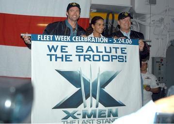 | Keywords: US Navy 060524-N-7365V-090 U.S. Navy Fleet Week New York 2006.jpg en New York Harbor May 24 2006 - In the hangar bay aboard amphibious assault ship USS Kearsarge LHD 3 actors Hugh Jackman AKA Wolverine Ms Halle Berry AKA Storm and Kelsey Grammer AKA Dr Henry McCoy display a banner announcing the premiere of their latest movie the upcoming 20th Century Fox action sci-fi X-Men The Last Stand The stars and were aboard to visit with Sailors and embarked Marines during the opening day of Fleet Week New York 2006 The crew was also given a special sneak preview of the film before its worldwide release date of May 26 2006 Fleet Week has been sponsored by New York City since 1984 in celebration of the United States sea service The annual event also provides an opportunity for citizens of New York City and the surrounding Tri-State area to meet Sailors and Marines as well as witness first hand the latest capabilities of today's Navy and Marine Corps team Fleet week includes dozens of military demonstrations and displays including public tours of many of the participating ships U S Navy photo by Photographer's Mate Airman Dennard Vinson RELEASED 2006-05-24 060524-N-7365V-090 Navy http //www navy mil/view_image asp id 34877 U S Navy photo by Photographer's Mate Airman Dennard Vinson PD-USGov-Military-Navy New York Harbor Aboard USS Kearsarge LHD-3 Kelsey Grammer Hugh Jackman on the USS Kearsarge LHD-3 |