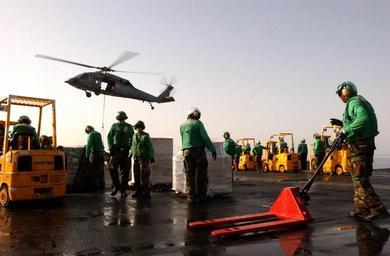 | Keywords: US Navy 060525-N-5549O-007 Crew members from the Nimitz-class aircraft carrier USS Ronald Reagan (CVN 76) supply department stand by to transport pallets of cargo.jpg en Persian Gulf May 25 2006 - Crew members from the Nimitz-class aircraft carrier USS Ronald Reagan CVN 76 supply department stand by to transport pallets of cargo while a MH-60S Knighthawk assigned to the Blackjacks of Helicopter Sea Combat Squadron Two One HSC-21 delivers cargo from the Fast Combat Support Ship USNS Rainier T-AOE 7 while conducting a vertical replenishment Reagan and Carrier Air Wing One Four CVW-14 are currently deployed as part of a routine rotation of U S maritime forces in support of the global war on terrorism as well as conducting Maritime Security Operations MSO in the region U S Navy photo by Photographer's Mate 3rd Class Kevin S O'Brien RELEASED 2006-05-25 060525-N-5549O-007 Navy http //www navy mil/view_image asp id 35013 U S Navy photo by Photographer's Mate 3rd Class Kevin S O'Brien PD-USGov-Military-Navy Helicopters at USS Ronald Reagan CVN-76 MH-60S Seahawk Helicopter Sea Combat Squadron 21 United States Navy |