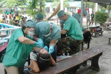 | Keywords: US Navy 060528-N-9076B-103 U.S. Navy Dentist, Cmdr. Jan DeLorey-Lytle, left, and Hospital Corpsman 3rd Class Rolando Ambat perform a tooth extraction during a dental assistance mission at Recodo Elementary School outside Zamboa.jpg en Zamboanga Republic of the Philippines May 28 2006 - U S Navy Dentist Cmdr Jan DeLorey-Lytle left and Hospital Corpsman 3rd Class Rolando Ambat perform a tooth extraction during a dental assistance mission at Recodo Elementary School outside Zamboanga City Several doctors from the U S Military Sealift Command MSC hospital ship USNS Mercy T-AH 19 and non-governmental organizations were part of a Medical Civil Action Program MEDCAP that helped more than a thousand people For the next several days the ship will be conducting humanitarian and civic assistance in the local area Mercy is on a five-month deployment to South Asia Southeast Asia and the Pacific Islands Mercy s medical crew will provide general and ophthalmology surgery basic medical evaluation and treatment preventive medicine treatment dental screenings and treatment optometry screenings eyewear distribution public health training and veterinary services as requested by the host nations Mercy is uniquely capable of supporting medical and humanitarian assistance needs and is configured with special medical equipment and a robust multi-specialized medical team that can provide a range of services ashore as well as aboard the ship The medical staff is augmented with an assistance crew many of whom are part of non-governmental organizations that have significant medical capabilities U S Navy photo by Chief Photographer's Mate Don Bray RELEASED 2006-05-28 060528-N-9076B-103 Navy http //www navy mil/view_image asp id 35204 U S Navy photo by Chief Photographer's Mate Don Bray PD-USGov-Military-Navy United States Navy in Zamboanga City Aboard USNS Mercy T-AH-19 |