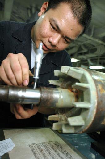 | Keywords: US Navy 060529-N-1332Y-476 Machinery Repairman Fireman Dave Evangelista uses a caliper to measure a bearing from an Aqueous Film Forming Foam (AFFF) sprinkler component in the machine shop aboard USS Kitty Hawk (CV 63).jpg en Pacific Ocean May 29 2006 - Machinery Repairman Fireman Dave Evangelista uses a caliper to measure a bearing from an Aqueous Film Forming Foam AFFF sprinkler component in the machine shop aboard USS Kitty Hawk CV 63 The machine shop is responsible for the manufacture and maintenance of all metal components on the ship Currently under way in the 7th Fleet area of responsibility AOR Kitty Hawk demonstrates power projection and sea control as the U S Navy's only permanently forward-deployed aircraft carrier U S Navy photo by Photographer's Mate Airman Adam York RELEASED 2006-05-29 060529-N-1332Y-476 Navy http //www navy mil/view_image asp id 35284 U S Navy photo by Photographer's Mate Airman Adam York PD-USGov-Military-Navy Aboard USS Kitty Hawk CV-63 Aqueous Film Forming Foam |