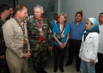 | Keywords: US Navy 060605-N-3931M-286 ommander, U.S. Pacific Command, Adm. William Fallon, talks with Commanding Officer of the Medical Treatment Facility U.S. Navy Capt. Joseph Moore, aboard U.S. Military Sealift Command (MSC) Hospital s.jpg en Jolo Philippines June 5 2006 - Commander U S Pacific Command Adm William Fallon talks with Commanding Officer of the Medical Treatment Facility U S Navy Capt Joseph Moore aboard U S Military Sealift Command MSC Hospital ship USNS Mercy T-AH 19 while touring a Medical and Dental Civil Action Project MEDCAP while the ship visits the city on a scheduled humanitarian mission Mercy is on a five-month deployment to South Asia Southeast Asia and the Pacific Islands The medical crew aboard Mercy will provide general and ophthalmology surgery basic medical evaluation and treatment preventive medicine treatment dental screenings and treatment optometry screenings eyewear distribution public health training and veterinary services as requested by the host nations Mercy is uniquely capable of supporting medical and humanitarian assistance needs and is configured with special medical equipment and a robust multi-specialized medical team who can provide a range of services ashore as well as aboard the ship The medical staff is augmented with an assistance crew many of whom are part of non-governmental organizations which have significant medical capabilities U S Navy photo by Photographer's Mate 1st Class Michael R McCormick RELEASED 2006-06-05 060605-N-3931M-286 Navy http //www navy mil/view_image asp id 35464 U S Navy photo by Photographer's Mate 1st Class Michael R McCormick PD-USGov-Military-Navy Images from US Navy location Jolo Philippines Aboard USNS Mercy T-AH-19 |