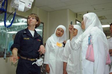 | Keywords: US Navy 060607-N-9437R-297 A U.S. Navy nurse, Lt. Tara Collins, shows local Jolo healthcare providers a new Intensive Care Unit patient monitoring system on board the U.S. Military Sealift Command (MSC) Hospital ship USNS Mercy.jpg en Jolo Philippines June 7 2006 A U S Navy nurse Lt Tara Collins shows local Jolo healthcare providers a new Intensive Care Unit patient monitoring system on board the U S Military Sealift Command MSC Hospital ship USNS Mercy T-AH 19 which is deployed to South and Southeast Asia and the Pacific Islands at the invitation of host nations in the region The healthcare professionals are from the Sulu Provincial Hospital the largest hospital facility in the Sulu Province Radford and a group of Mercy s Medical/Dental Civic Action Project crew have been working at Sulu Provincial the past four days conducting medical and dental screenings and minor procedures The medical crew on board Mercy provides general and ophthalmology surgery basic medical evaluation and treatment preventive medicine treatment dental screenings and treatment optometry screenings eyewear distribution public health training and veterinary services as requested by the host nations The medical staff is augmented with an assistance crew many of whom are part of nongovernmental organizations that have significant medical capabilities U S Navy photo by Chief Journalist Stephen K Robinson RELEASED 2006-06-07 060607-N-9437R-297 Navy http //www navy mil/view_image asp id 35520 U S Navy photo by Chief Journalist Stephen K Robinson PD-USGov-Military-Navy Images from US Navy location Jolo Philippines Aboard USNS Mercy T-AH-19 Intensive-care units |