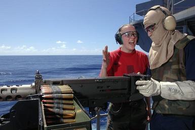 | Keywords: US Navy 060612-N-3946H-060 Gunner's Mate 2nd Class Teresa Keener instructs a Sailor assigned to the Weapons Department on the operation of a .50-caliber machine gun.jpg en Pacific Ocean June 12 2006 - Gunner's Mate 2nd Class Teresa Keener instructs a Sailor assigned to the Weapons Department on the operation of a 50-caliber machine gun during a live fire exercise on the fantail aboard the conventionally-powered aircraft carrier USS Kitty Hawk CV 63 Currently under way in the 7th Fleet area of responsibility AOR Kitty Hawk demonstrates power projection and sea control as the U S Navy's only permanently forward-deployed aircraft carrier operating from Yokosuka Japan U S Navy photo by Photographer's Mate Airman Patrick L Heil RELEASED 2006-06-12 060612-N-3946H-060 Navy http //www navy mil/view_image asp id 35745 U S Navy photo by Photographer's Mate Airman Patrick L Heil PD-USGov-Military-Navy Browning M2 of the US Navy Keener family Aboard USS Kitty Hawk CV-63 Gunner's Mate |