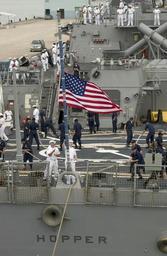 | Keywords: US Navy 060614-N-9851B-003 Sailors aboard Arleigh Burke-class guided missile destroyer USS Hopper (DDG 70) lower the American Flag on the ship's fantail as Hopper shifts colors for getting underway.jpg en Singapore June 14 2006 - Sailors aboard Arleigh Burke-class guided missile destroyer USS Hopper DDG 70 lower the American Flag on the ship's fantail as Hopper shifts colors for getting underway Hopper is departing Changi Naval Base Singapore after the completion of the Singapore phase of exercise Cooperation Afloat Readiness and Training CARAT CARAT is an annual series of bilateral maritime training exercises between the U S and six Southeast Asian nations designed to build relationships and enhance the operational readiness of the participating forces U S Navy photo by Mass Communication Specialist 2nd Class John L Beeman RELEASED 2006-06-14 060614-N-9851B-003 Navy http //www navy mil/view_image asp id 35835 U S Navy photo by Mass Communication Specialist 2nd Class John L Beeman PD-USGov-Military-Navy Naval ships of the United States in Singapore Aboard USS Hopper DDG-70 Cooperation Afloat Readiness and Training 2006 Changi Naval Base |