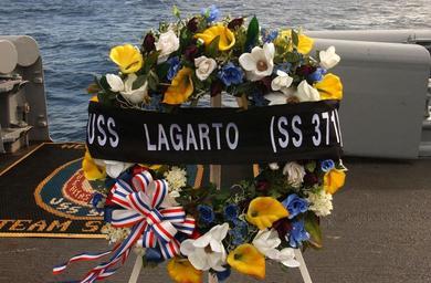 | Keywords: US Navy 060617-N-3483C-002 A wreath that will be placed in the ocean above the resting site of what is believed to be the World War II submarine USS Lagarto (SS 371).jpg en Gulf of Thailand June 17 2006 - A wreath that will be placed in the ocean above the resting site of what is believed to be the World War II submarine USS Lagarto SS 371 is displayed during a memorial at sea aboard the salvage ship USS Salvor ARS 52 The ceremony was in remembrance of Lagarto's lost crew of 86 Sailors Divers assigned to Salvor conducted six-days of diving to positively identify Lagarto as part of the Thailand phase of the exercise Cooperation Afloat Readiness and Training or CARAT Divers will send photographs and video of the submarine to the Naval Historical Center in Washington for further analysis CARAT is an annual series of bilateral maritime training exercises between the United States and six Southeast Asia nations designed to build relationships and enhance the operational readiness of the participating forces U S Navy Photo by Mass Communication Specialist 2nd Class Robert Cole RELEASED 2006-06-17 060617-N-3483C-002 Navy http //www navy mil/view_image asp id 35911 U S Navy Photo by Mass Communication Specialist 2nd Class Robert Cole PD-USGov-Military-Navy Aboard USNS Salvor T-ARS-52 Cooperation Afloat Readiness and Training 2006 USS Lagarto SS-371 Memorial wreaths |