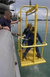 | Keywords: US Navy 060621-N-9851B-006 Royal Thai Navy diver Ensign Mongkol Boontun and U.S. Navy diver Damage Controlman 2nd Class John Marshall are raised from the water on a diving stage from rescue and salvage ship USS Salvor (ARS 52).jpg en Sattahip Thailand June 21 2006 Royal Thai Navy diver Ensign Mongkol Boontun and U S Navy diver Damage Controlman 2nd Class John Marshall are raised from the water on a diving stage from rescue and salvage ship USS Salvor ARS 52 The Royal Thai Navy divers were visiting Salvor for familiarization training during the Thailand phase of exercise Cooperation Afloat Readiness and Training CARAT CARAT is an annual series of bilateral maritime training exercises between the United States and six Southeast Asia nations designed to build relationships and enhance the operational readiness of the participating forces U S Navy photo by Mass Communication Specialist 2nd Class John L Beeman RELEASED 2006-06-21 060621-N-9851B-006 Navy http //www navy mil/view_image asp id 36085 U S Navy photo by Mass Communication Specialist 2nd Class John L Beeman PD-USGov-Military-Navy Images from US Navy location Sattahip Thailand Aboard USNS Salvor T-ARS-52 CARAT Thailand 2006 |