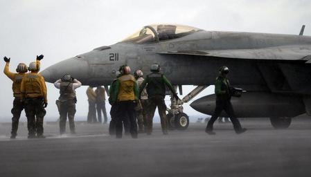| Keywords: US Navy 060622-N-7130B-384 Flight deck personnel prepare an F-A-18E Super Hornet for launch during Exercise Valiant Shield aboard the Nimitz-class aircraft carrier USS Ronald Reagan (CVN 76) in a rain shower.jpg en Pacific Ocean June 22 2006 - Flight deck personnel prepare an F/A-18E Super Hornet for launch during Exercise Valiant Shield aboard the Nimitz-class aircraft carrier USS Ronald Reagan CVN 76 in a rain shower Valiant Shield focuses on integrated joint training among U S military forces enabling real-world proficiency in sustaining joint forces and in detecting locating tracking and engaging units at sea in the air on land and cyberspace in response to a range of mission areas U S Navy photo by Photographer's Mate 2nd Class Aaron Burden RELEASED 2006-06-22 060622-N-7130B-384 Navy http //www navy mil/view_image asp id 36101 U S Navy photo by Photographer's Mate 2nd Class Aaron Burden PD-USGov-Military-Navy Valiant Shield 2006 F/A-18 Hornet launches from USS Ronald Reagan CVN-76 F/A-18E Super Hornet on flight decks |