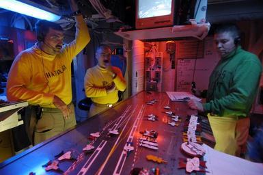 | Keywords: US Navy 060622-N-3136P-090 Flight Deck Control Handler, Lt. Cmdr. Gil Mucke and Assistant Flight Deck Control Officer, Lt. Alberto Dones monitor the movement of aircraft on the ouji board.jpg en Philippine Sea June 22 2006 - Flight Deck Control Handler Lt Cmdr Gil Mucke and Assistant Flight Deck Control Officer Lt Alberto Dones monitor the movement of aircraft on the ouji board in the flight deck control center during night-time flight operations aboard the conventionally-powered aircraft carrier USS Kitty Hawk CV 63 The Kitty Hawk Carrier Strike group is currently participating in Valiant Shield 2006 Valiant Shield focuses on integrated joint training among U S military forces enabling real-world proficiency in sustaining joint forces and in detecting locating tracking and engaging units at sea in the air on land and cyberspace in response to a range of mission areas U S Navy photo by Photographer's Mate Airman Jimmy C Pan RELEASED 2006-06-22 060622-N-3136P-090 Navy http //www navy mil/view_image asp id 36115 U S Navy photo by Photographer's Mate Airman Jimmy C Pan PD-USGov-Military-Navy Ouija boards aircraft carrier Valiant Shield 2006 Aboard USS Kitty Hawk CV-63 |