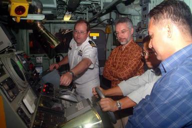 | Keywords: US Navy 060626-N-4124C-073 Commanding Officer USS Patriot (MCM 7), Lt. Cmdr. Richard D. Brawley discusses elements of the ship's command console to U.S. ambassador to Brunei, the Honorable Emil Skodon, and senior officers of th.jpg en Maura Port Brunei June 26 2006 -Commanding Officer USS Patriot MCM 7 Lt Cmdr Richard D Brawley discusses elements of the ship's command console to U S ambassador to Brunei the Honorable Emil Skodon and senior officers of the Royal Brunei Armed forces Army and Navy during a reception held aboard the ship Patriot with embarked Explosive Ordnance Disposal Mobile Unit Five EODMU-5 Detachment 51 is making a scheduled port visit to Brunei to enhance U S - Brunei relations Patriot is currently deployed to Southeast Asia to increase interoperability in mine neutralization warfare and maritime operations in the region U S Navy photo by Mass Communication Specialist Adam R Cole RELEASED 2006-06-26 060626-N-4124C-073 Navy http //www navy mil/view_image asp id 36276 U S Navy photo by Mass Communication Specialist Adam R Cole PD-USGov-Military-Navy United States Navy Explosive Ordnance Disposal Emil Skodon USS Patriot MCM-7 Taken with Fujifilm FinePix S2 Pro Explosive Ordnance Disposal Mobile Unit 5 |