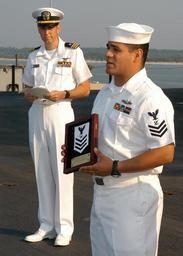 | Keywords: US Navy 060630-N-6651N-001 Mass Communication Specialist (MC) 1st Class Arthur Delacruz, right, one of the first Sailors in the Navy to wear the new MC-rating badge, addresses members of the legacy ratings during the media rati.jpg en Mayport Fla June 30 2006 - Mass Communication Specialist MC 1st Class Arthur Delacruz right one of the first Sailors in the Navy to wear the new MC-rating badge addresses members of the legacy ratings during a media ratings merger ceremony held aboard USS John F Kennedy CV 67 Kennedy s Media Officer Lt Cmdr Doolittle left spoke on the history of navy rating badges and then presented Delacruz with a custom-made MC rating badge in advance of the official production uniform article Additionally Delacruz volunteered for the midnight-to-four am quarterdeck watch to be the first MC Navy-wide to assume the watch displaying the new rating badge that becomes official at midnight July 1 2006 U S Navy photo by Photographer s Mate 2nd Class Monica R Nelson RELEASED 2006-06-30 060630-N-6651N-001 Navy http //www navy mil/view_image asp id 36308 U S Navy photo by Photographer s Mate 2nd Class Monica R Nelson PD-USGov-Military-Navy Images from US Navy location Duval County Florida Aboard USS John F Kennedy CV-67 Mass Communication Specialist |