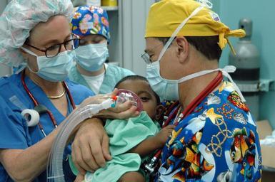 | Keywords: US Navy 060702-N-3532C-010 Operation Smile volunteers Janet Casabon Benowitz and Dr. Bill Pond anesthetize a young child before undergoing corrective plastic surgery on his cleft lip.jpg en Chittagong Bangladesh July 2 2006 Operation Smile volunteers Janet Casabon Benowitz and Dr Bill Pond anesthetize a young child before undergoing corrective plastic surgery on his cleft lip aboard U S Naval hospital ship USNS Mercy T-AH 19 during the ship s visit to provide humanitarian and civic assistance to the people of Bangladesh Mercy is on a five-month deployment to South Asia Southeast Asia and the Pacific Islands having recently completed 24 days of humanitarian assistance to the people of the southern Philippines The medical crew aboard Mercy will provide general and ophthalmology surgery basic medical evaluation and treatment preventive medicine treatment dental screenings and treatment optometry screenings eyewear distribution public health training and veterinary services as requested by the host nations Mercy is uniquely capable of supporting medical and humanitarian assistance needs and is configured with special medical equipment and a robust multi-specialized medical team that can provide a range of services ashore as well as aboard the ship The medical staff is augmented with an assistance crew many of whom are part of nongovernmental organizations that have significant medical capabilities U S Navy photo by Mass Communication Specialist Seaman Joseph Caballero RELEASED 2006-07-02 060702-N-3532C-010 Navy http //www navy mil/view_image asp id 36338 U S Navy photo by Mass Communication Specialist Seaman Joseph Caballero PD-USGov-Military-Navy Images from US Navy location Chittagong Bangladesh |